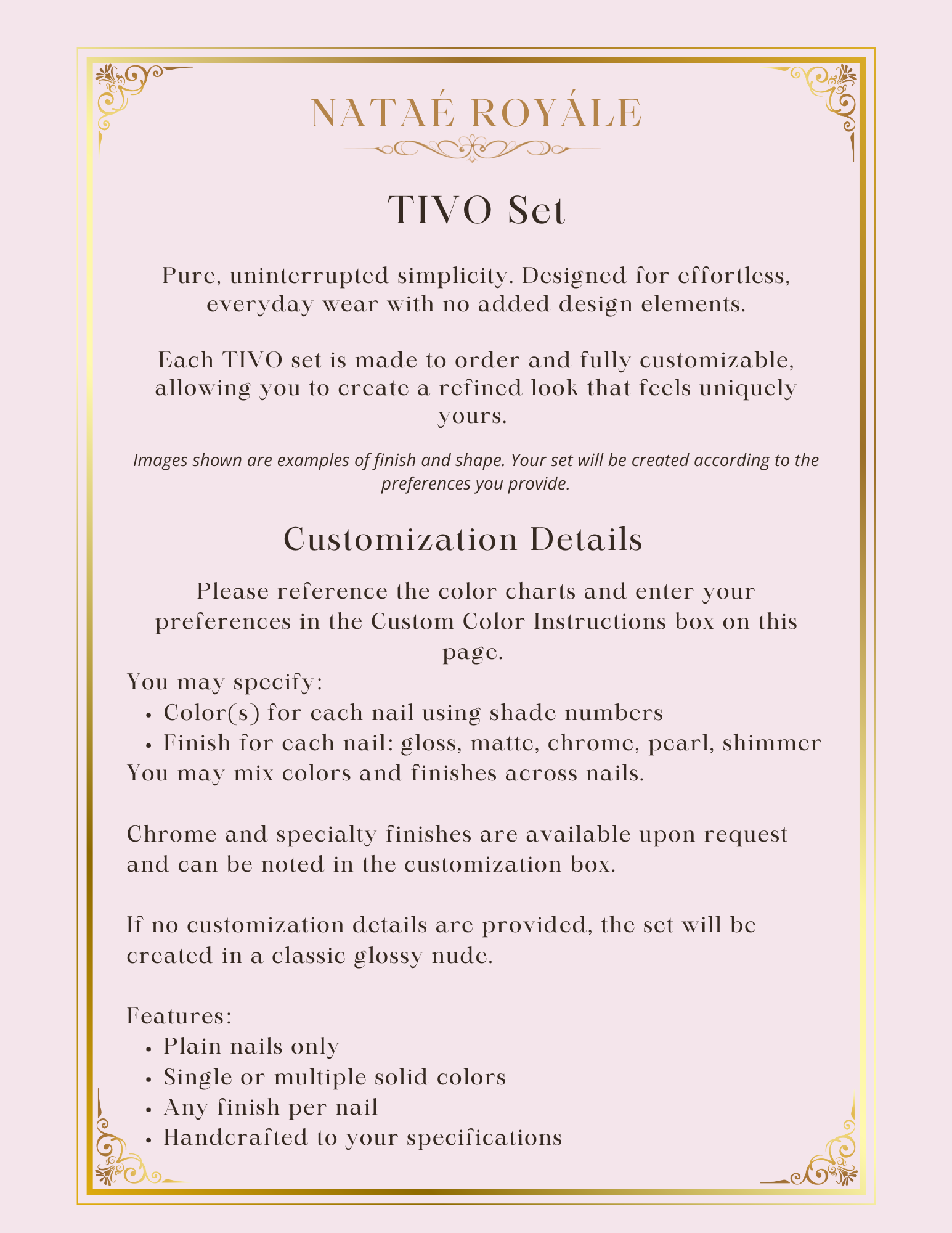 Each TIVO Set is made to order and fully customizable, allowing you to create a refined look that feels uniquely yours.